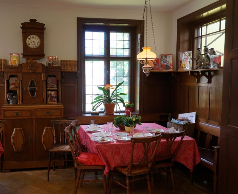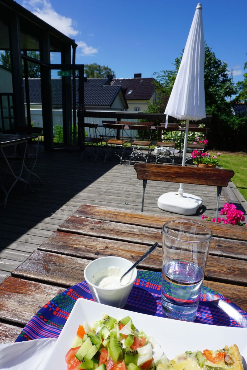 Efter utställningarna kurrade magen så jag bestämde mig för att äta något på Möllegårdens Kafé Charlotte med en fin lekhörna med utklädningskläder, spel och annat för barnen. Valde en enkel men god lunchpaj med sallad och en Ramlösa som jag trots den mysiga gammaldags kaféinredningen bestämde mig för att inta i den för dagen soliga men något blåsiga trädgården på baksidan av byggnaden.