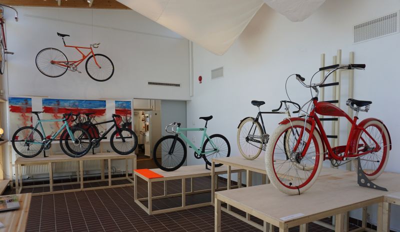 I cykelutställningen kan man se hur cykeln utvecklats genom åren. Här finns modernare single-speed cyklar där allt onödigt är bortplockat – påhittat av New yorks cykelbud som ville cykla så lätt som möjligt. Här finns också en cykel som man trampar liggande. Bland de äldre modellerna finns en Husqvarna från 1939 – en Twist racer med “kylarprydnad” á la Rolls-Royce på främre stänkskärmen.