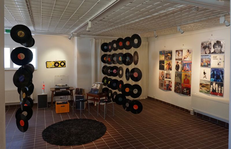 Från taket hänger LP-skivor och på väggarna sitter nostalgiska skivfodral. Här finns också en docka i tidsenlig stormönstrad 60-tals klädsel, och en reseskivspelare som för många på 50- och 60-talet var den första skivspelaren och jag minns lyckan när jag fick min egen. Minns hur jag själv satt med innerfördralet och sjöng med i låttexterna i låt efter låt. Omslagen på skivorna var viktiga och studerades noga under tiden man lyssnade och nu ser jag hur de präglade sin tid. Att följa en artists skivomslag genom karriären är en tidsresa.